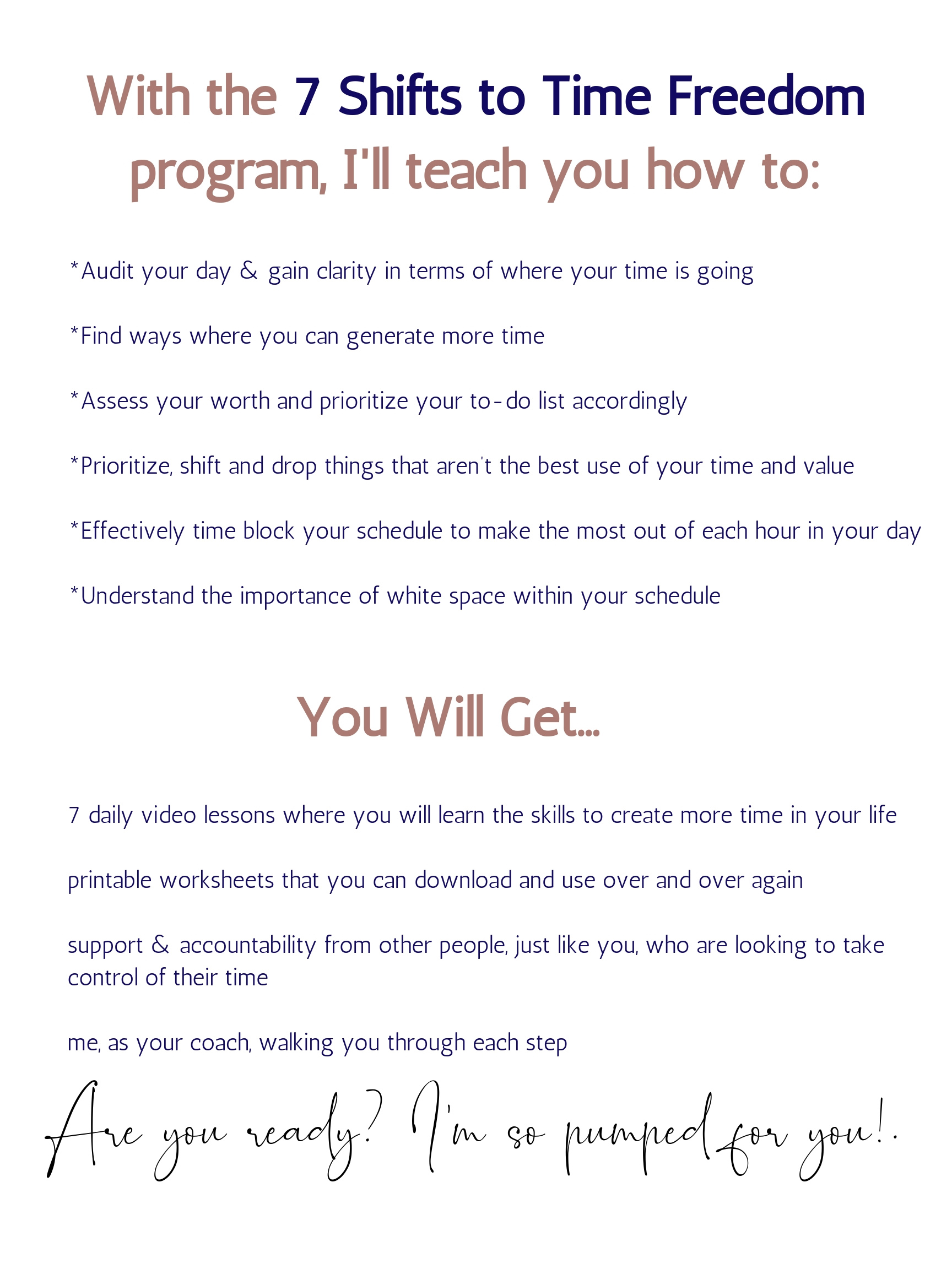 A 7 step process to help you eliminate stress and feel more joy in the process by shifting your mindset around time, learning how to say "no", prioritizing your to-do list and creating a schedule that works!